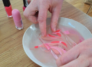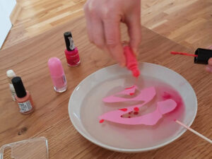 Naplňte tanier teplou vodou. Do vody nakvapkajte kvapky laku na nechty a špáradlom ňou premiešajte (miešať treba pomaly a zľahka, aby sa lak neprilepil na tanier alebo špáradlo). Na povrchu vody dostanete obraz z laku / lakov (ak použijete viac farieb). Pomaly položte prednú (nie vnútornú) stranu krytu mobilného telefónu do vody. Obraz sa tak premaľuje na telefón. Nechajte osušiť a kryt máte hotový!